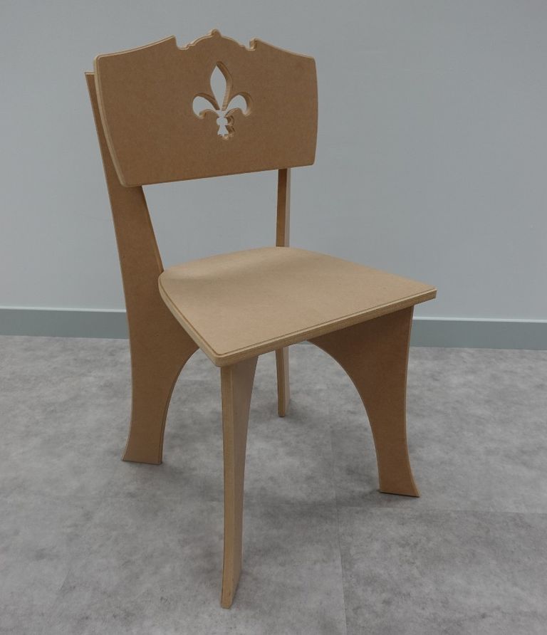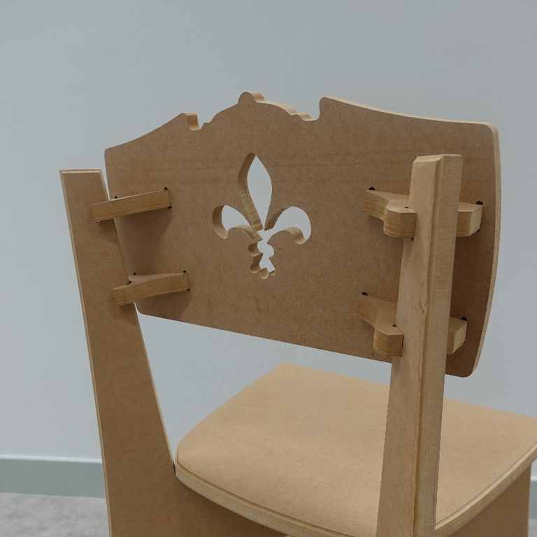 The Robespierre Chair is designed to be CNC-cut and assembled without the use of screws, highlighting contemporary fabrication and assembly methods while maintaining a historically influenced visual language.